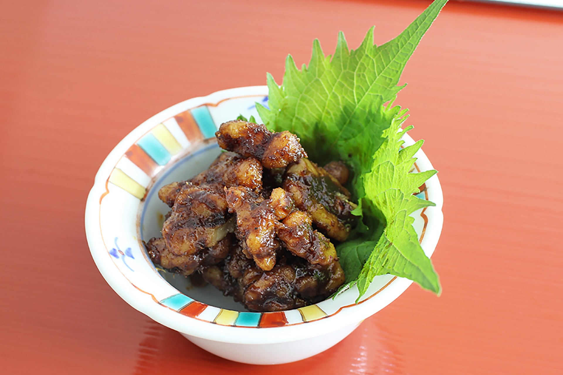 柔らかさが特徴の「ぎんぽ」を使用し「胡麻」をあわせ丸大豆商醤油などで塩味を抑え「優しい」味付けで炊き上げました。